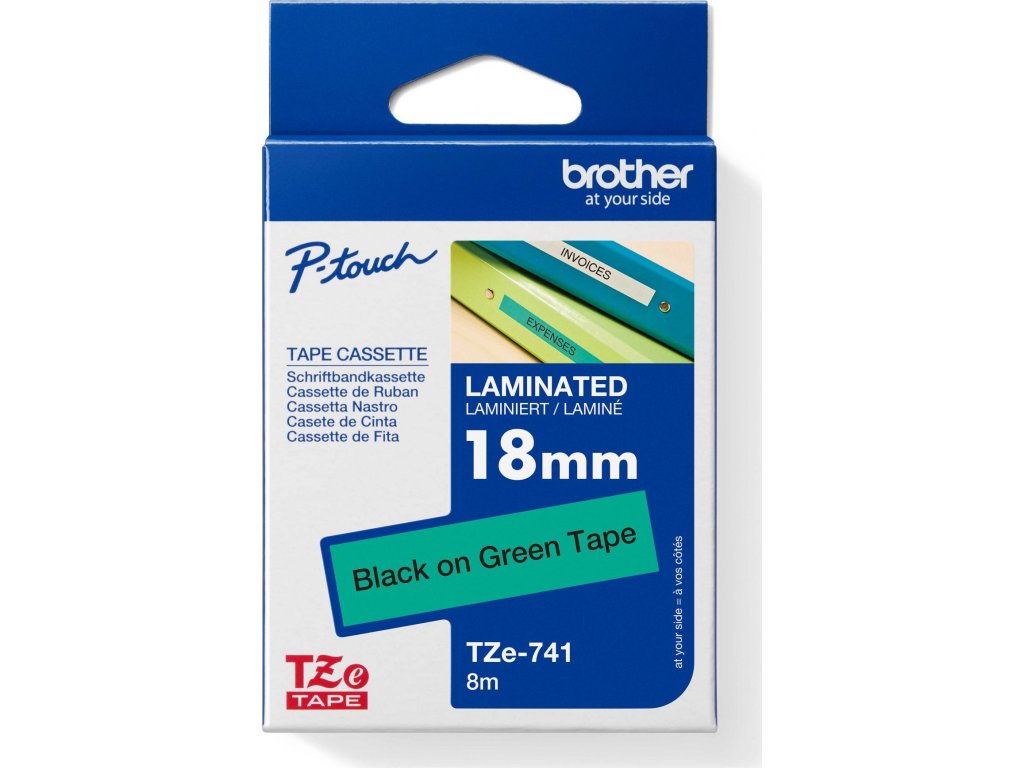 Originální kazeta s laminovanou páskou TZe-741 kompatibilní s širokou řadou tiskáren Brother P-touch je zvláště všestranná díky své snadno čitelné černé a zelené barvě - ideální pro domácnost, kancelář a další pracoviště.