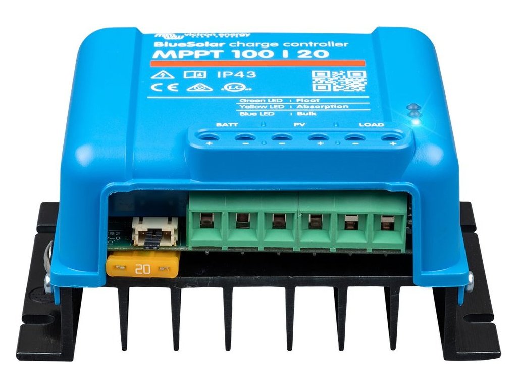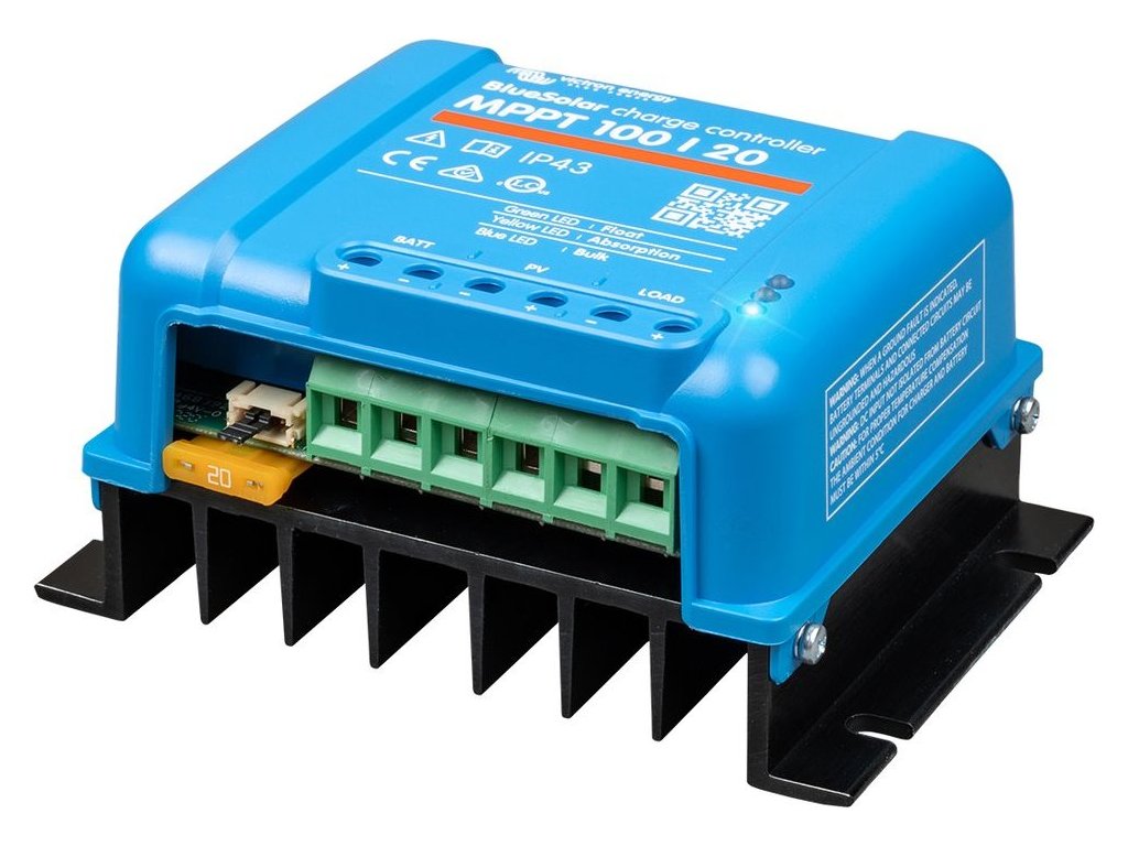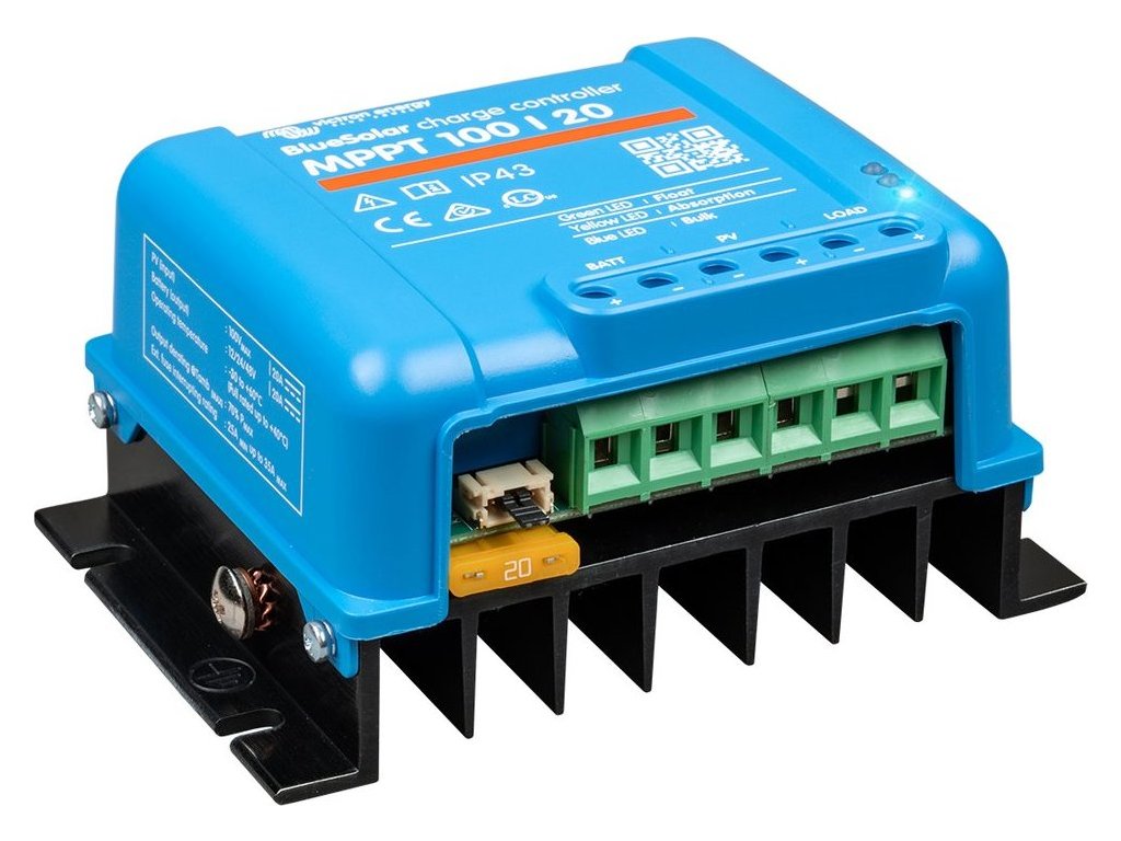 Victron BlueSolar 100/20 MPPTRobustní a rychlý MPPT regulátor pro náročné podmínky s napětím panelů až 100 V, maximální nabíjecí proud 20 A. Baterie 12/24/48 V, FV max. 290/580/1160 Wp.