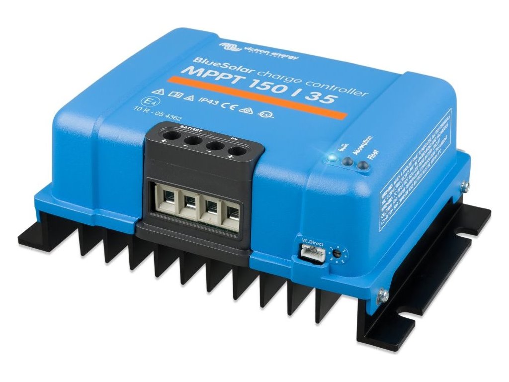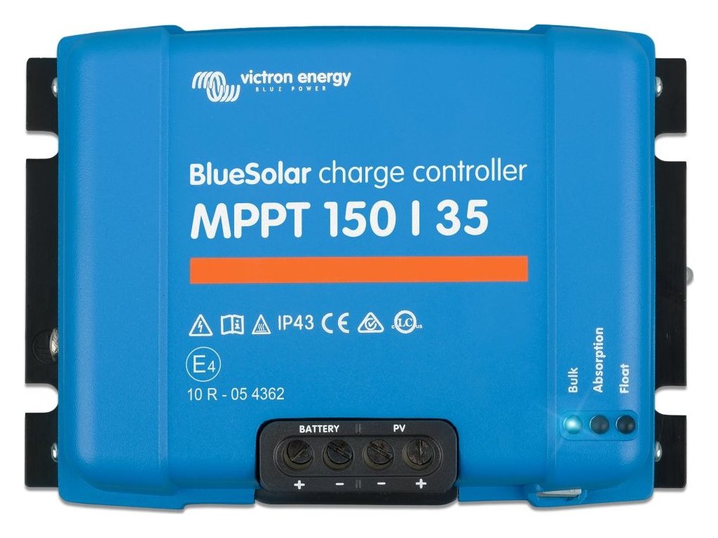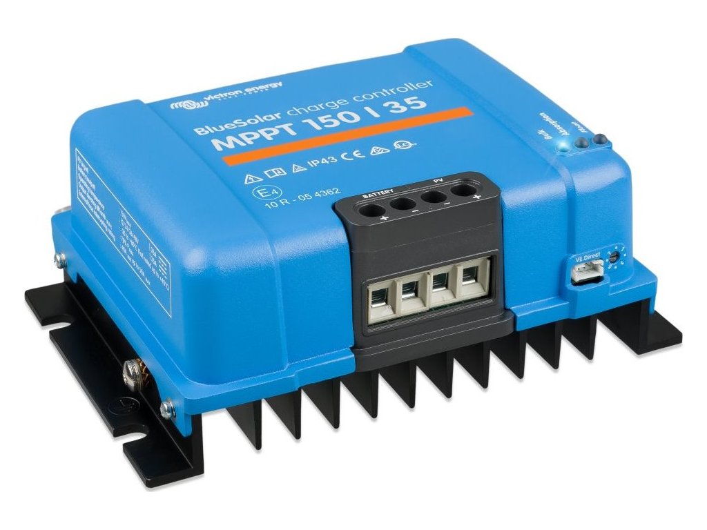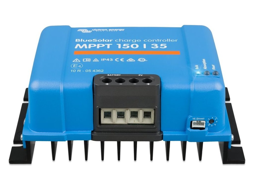 Victron BlueSolar 150/35 MPPTRobustní a rychlý MPPT regulátor pro náročné podmínky s napětím panelů až 150 V, maximální nabíjecí proud 35 A. Baterie 12/24/48 V, FV max. 500/1000/2000 Wp.
