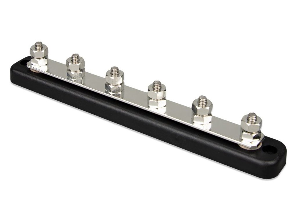 Victron DC přípojnice 150 A 6PDC přípojnice se používá pro distribuci vysokého DC proudu a současně také slouží jako připojení pro baterie a/nebo DC zařízení. Každá DC přípojnice je vybavena odnímatelným ochranným krytem.