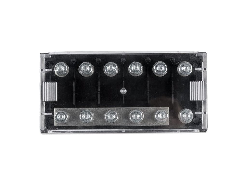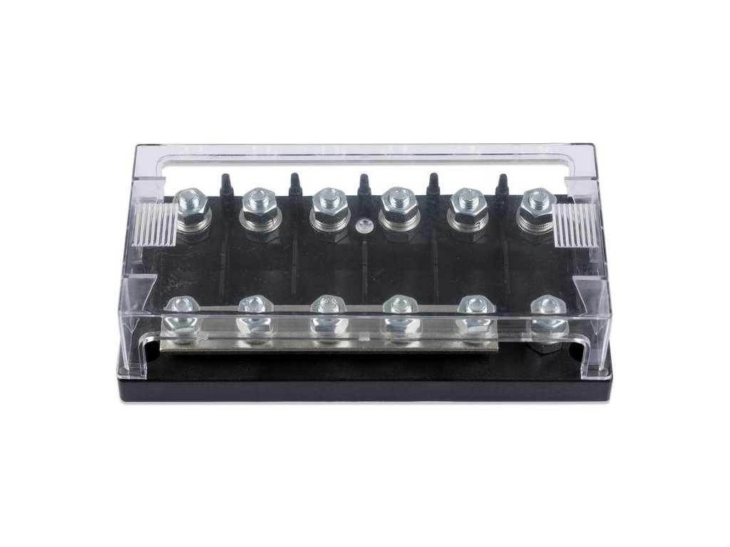 Victron 6cestný držák pro pojistky MEGA-fuseDržák pro až 6 pojistek Mega o maximálních proudech 60–500 A při 32 V nebo 125–300 A při 58 V. Snímatelná průhledná krytka. Pojistky se v držáku připevňují na dvojici šroubů M8. Určeno pro připevnění na zeď nebo jiný pevný podklad. Standardně se umísťuje mezi akumulátor a odběrné zařízení (např. měnič/nabíječka MultiPlus, Quattro atd.)