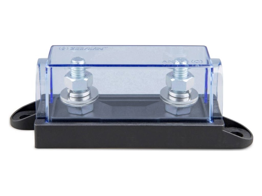 Victron držák pro pojistky MEGA-fuseDržák pojistek o maximálních proudech 60–500 A (32 V) nebo 125–300 A (58 V). Snímatelná krytka. Pojistky se v držáku připevňují na dvojici šroubů M8. Určeno pro připevnění na zeď nebo jiný pevný podklad. Standardně se umísťuje mezi akumulátor a odběrné zařízení (např. měnič/nabíječka MultiPlus, Quattro atd.)