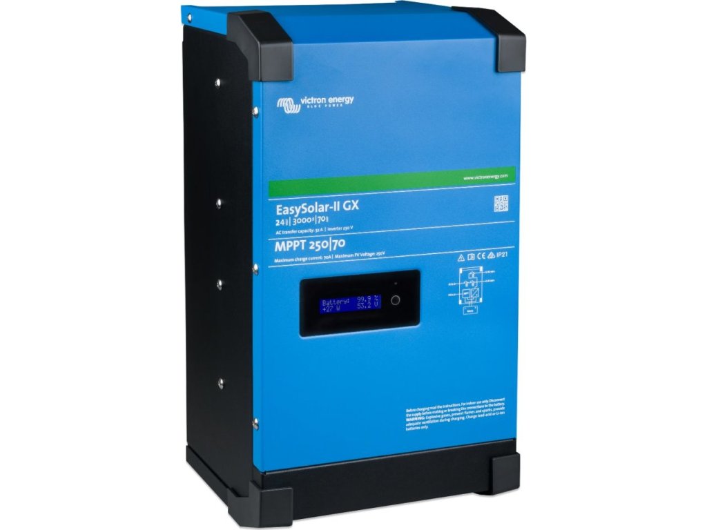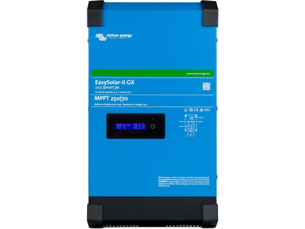 Victron EasySolar-II 24/3000/70-32 MPPT 250/70 GXKomplexní řešení pro ostrovní nebo hybridní solární systém. K jednotce připojíme solární panely, baterii, spotřebiče, elektrocentrálu nebo rozvodnou síť a máme profesionální 1f hybridní/ostrovní systém (3000 VA, 2400 W měnič, 24 V baterie, FV max. 2000 Wp).
