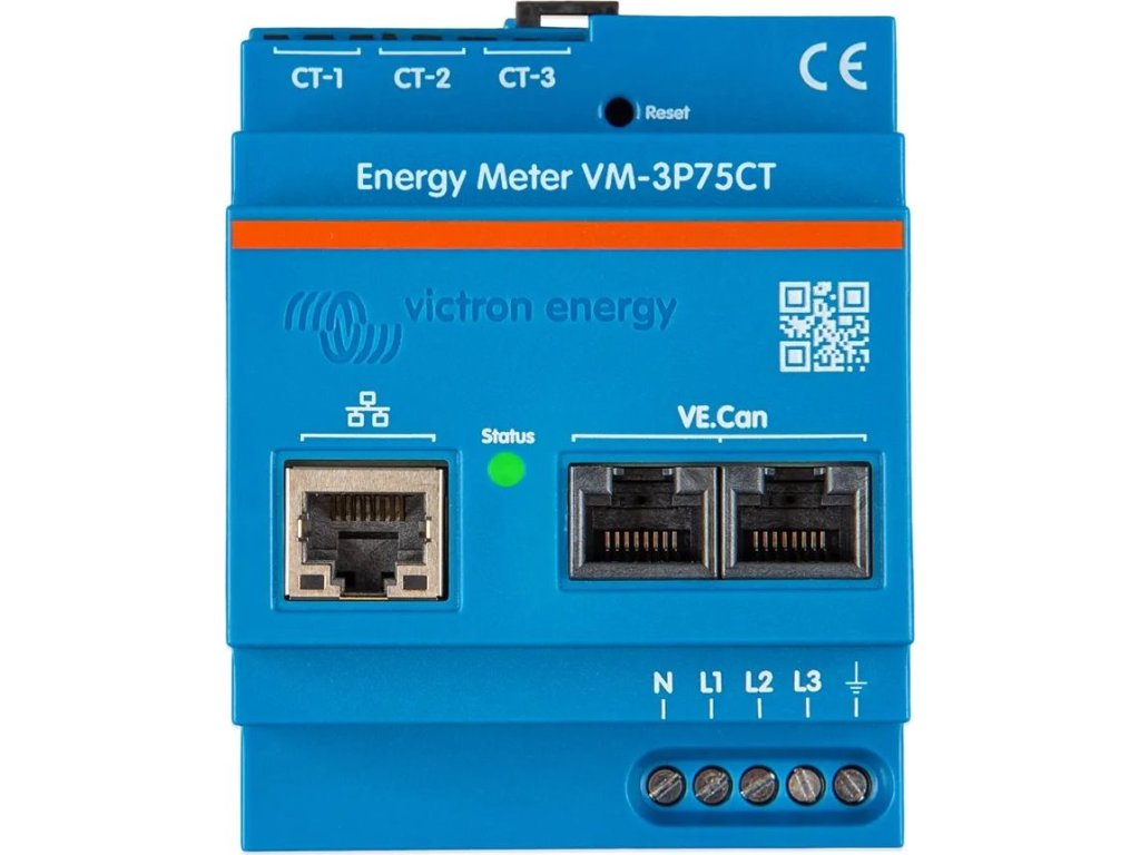 Victron Energy meter VM-3P75CTMěřič VM-3P75CT je navržen pro měření výkonu a energie v jednofázových a třífázových systémech pro skladování energie (ESS), nebo pro měření výkonu střídače fotovoltaického systému, generátoru střídavého proudu či hybridního střídače. Obsahuje integrované Ethernetové a VE.Can porty pro připojení k GX zařízením, a díky proudovým čidlům umožňuje snadnou a rychlou instalaci bez potřeby úprav stávající elektroinstalace. Elektroměr je plně funkční ihned po vybalení (Plug and Play) a slouží jako síťový měřič pro většinu systémů. Provedení konfigurace (pomocí VictronConnect) je nezbytné pouze v případě změny role (Grid Meter, PV Inverter, AC Genset nebo AC Load Meter) a ruční nastavení IP adresy. Informace lze zobrazit na GX zařízeních, jako jsou Cerbo GX nebo Ekrano GX, a rovněž v aplikaci VictronConnect a na portálu VRM.