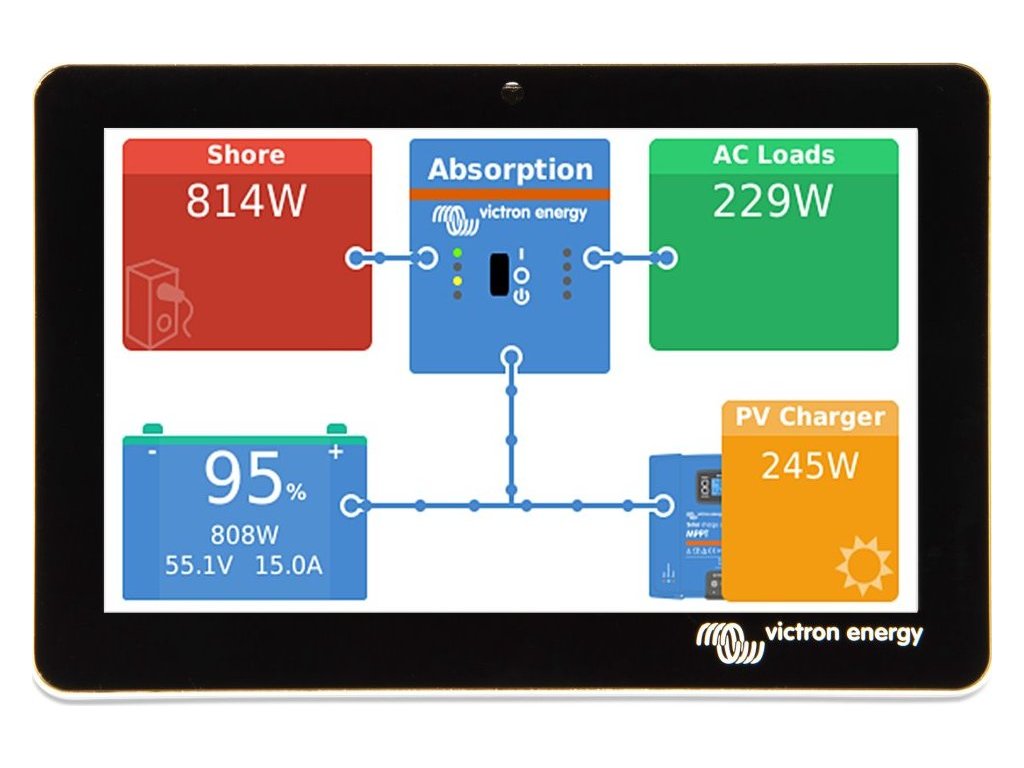 Dotykový displej GX Touch je optimalizován tak, aby splňoval standardy odborníků provádějících instalaci. Displej lze přišroubovat přímo na palubní desku, takže není zapotřebí vyřezávat vhodný otvor (jak tomu bylo u zařízení Color Control GX). Připojuje se pouze jedním kabelem, což znamená, že už nemusíte táhnout k palubní desce více kabelů.