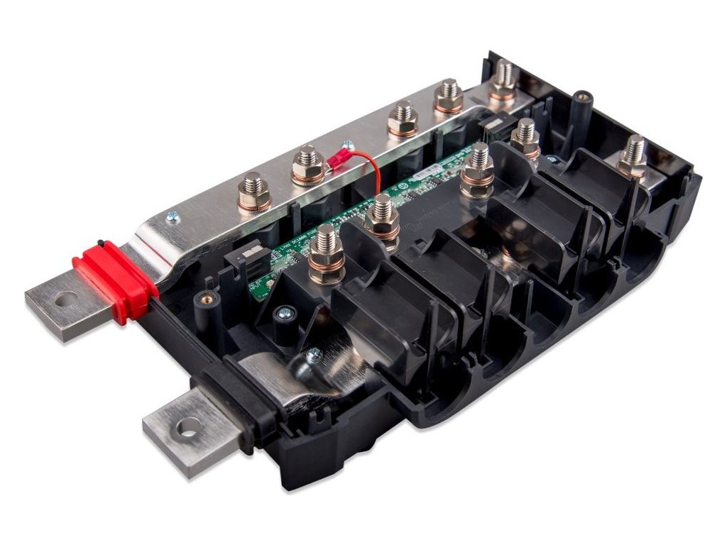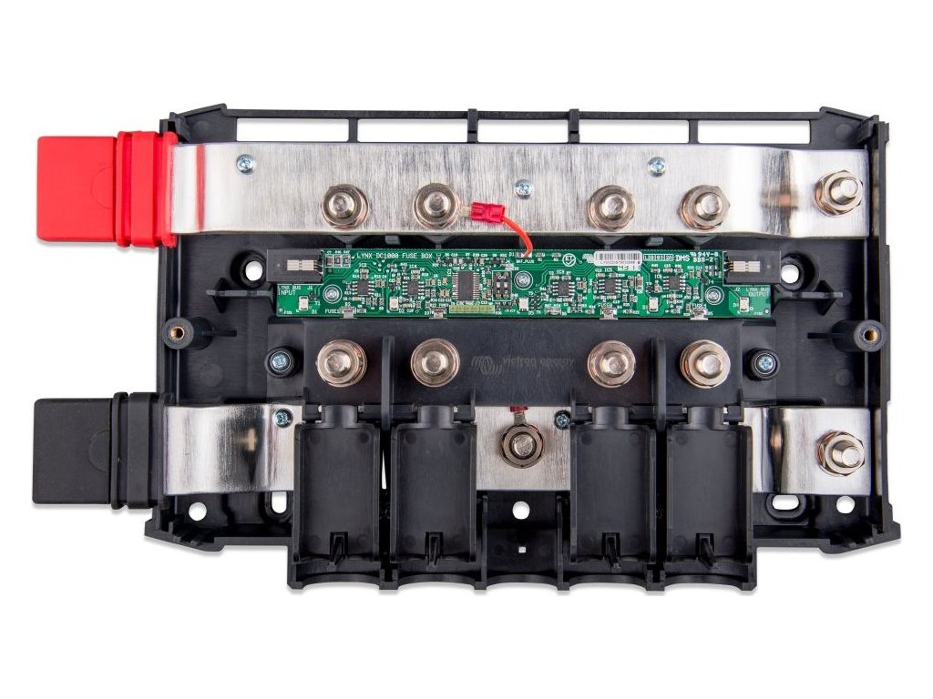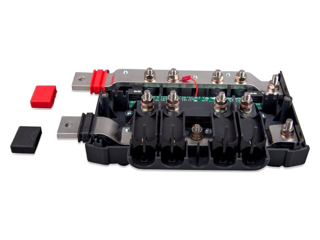 Victron Lynx DistributorModulární pojistková jednotka určená pro čtyři pojistky. Sleduje jednotlivé pojistky a LED indikátor na přední straně indikuje jejich stav.