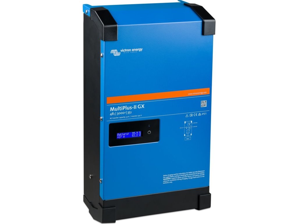 Victron MultiPlus-II GX 48V/3000VA/35A-32AMultiPlus-II GX je výkonný DC-AC hybridní měnič/nabíječ s čistě sinusovým výstupem, integrovanou adaptivní nabíječkou baterií a ultra rychlým transferovým přepínačem zdroje napájení (baterie/externí AC zdroj).