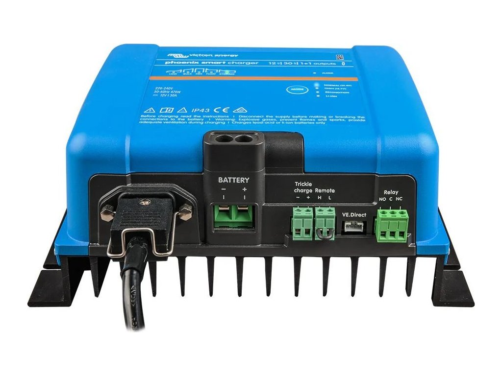Victron Phoenix Smart nabíječka 12 V/30 A (1+1 výstup)Inteligentní, výkonná a programovatelná nabíječka pro všechny druhy olověných baterií a Li-Ion (LiFePO4) baterie. Kabely pro připojení k baterii a napájecí kabel (IEC 320 C14) nejsou součástí balení.