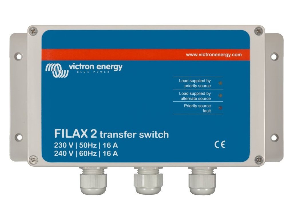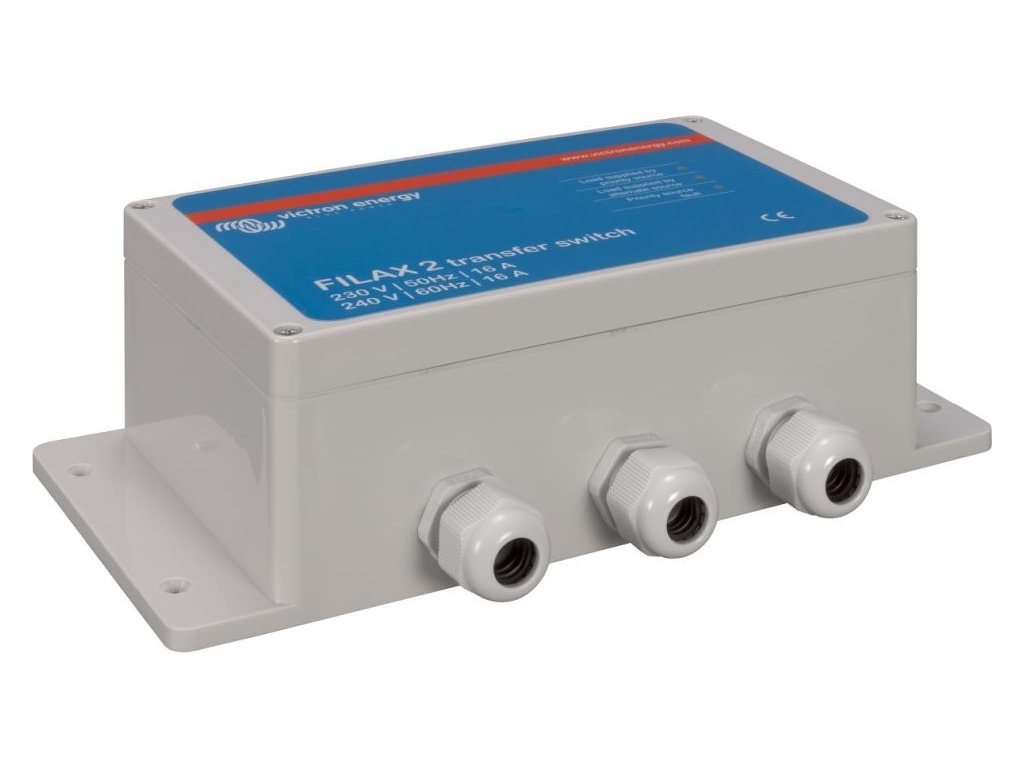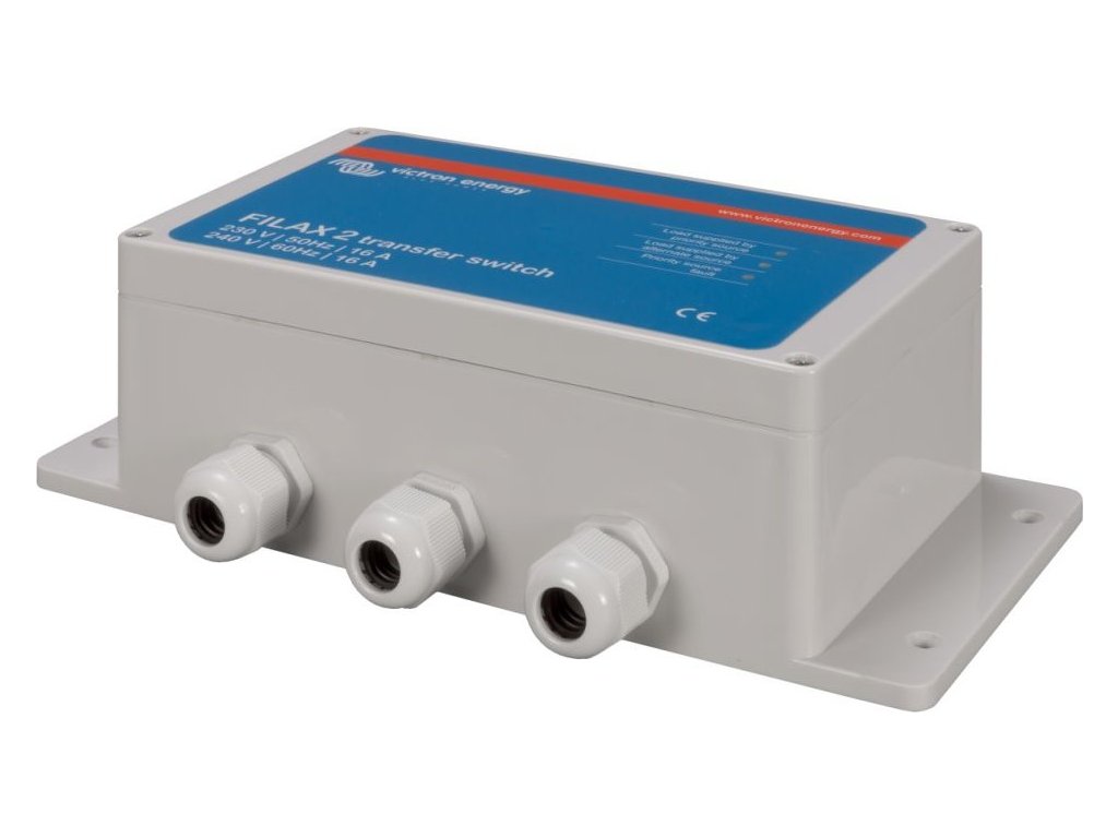 Victron Filax 2Přepínač Filax byl vyvinut pro přepínání napájení citlivých přístrojů jako např. počítače, průmyslové řídící systémy nebo moderní audiovizuální a zábavná technika z prioritního AC zdroje na druhý alternativní zdroj. Typickým prioritním zdrojem je el. rozvodná síť, generátor nebo jiný zdroj např. místní el. přípojka v přístavu nebo v kempu. Typickým alternativním zdrojem je DC-AC střídač (invertor).