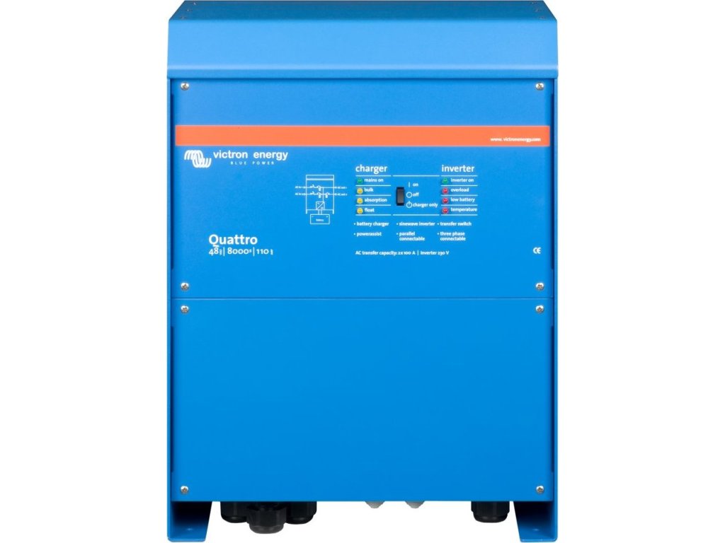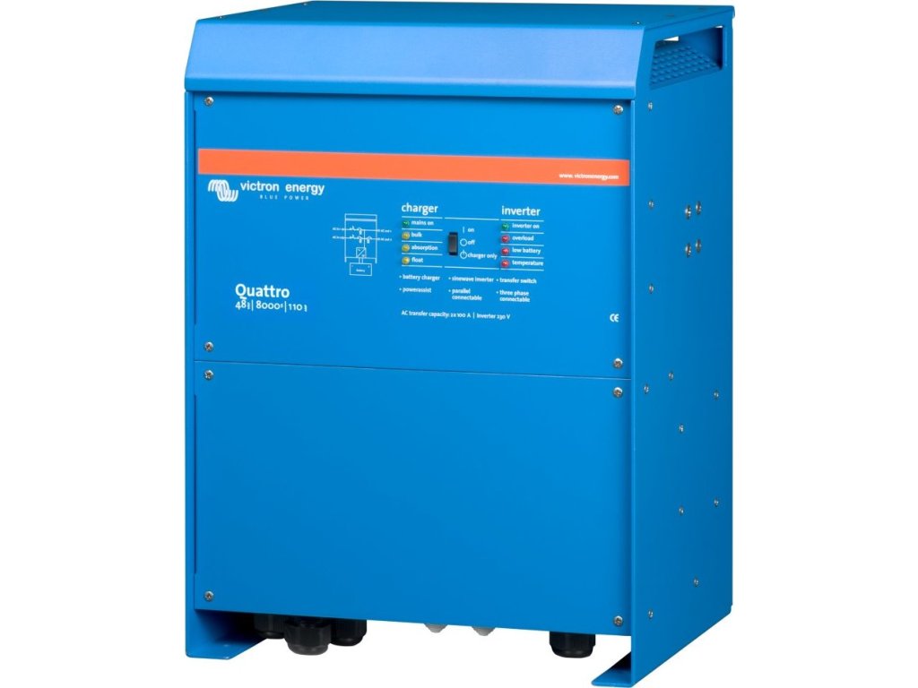 Victron Quattro 48 V (8000 VA)Quattro je sofistikovaná AC-DC nabíječka akumulátorů a DC-AC střídač (invertor) s dvěma AC vstupy, čistě sinusovým výstupním napětím a ultra rychlým přepínačem mezi sítí (generátorem) a akumulátory.