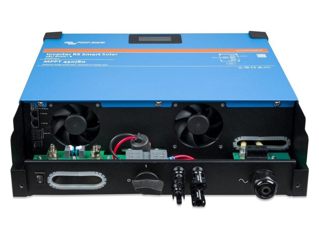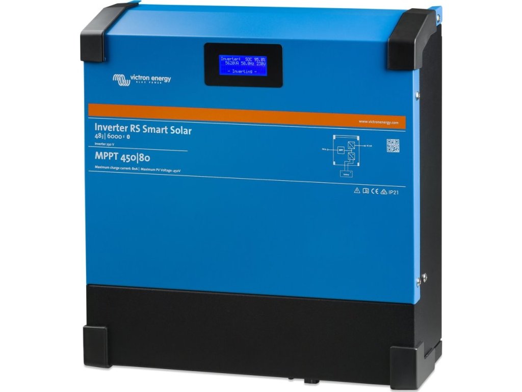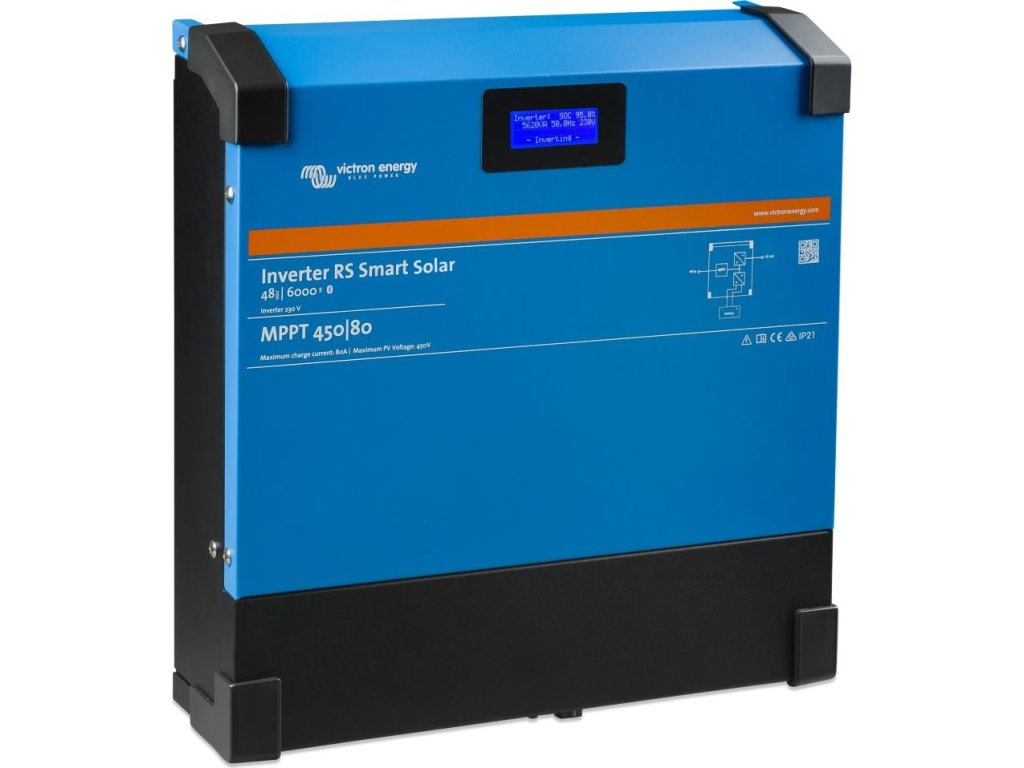 Victron SmartSolar RS 48/6000 230 VRS Smart Solar je kombinací výkonného měniče napětí (48 VDC, 6 kVA, 230 VAC) a vysokonapěťového solárního regulátoru MPPT 450 V (80 A) vhodný pro ostrovní systémy (bez AC vstupu pro distribuční síť nebo generátor).