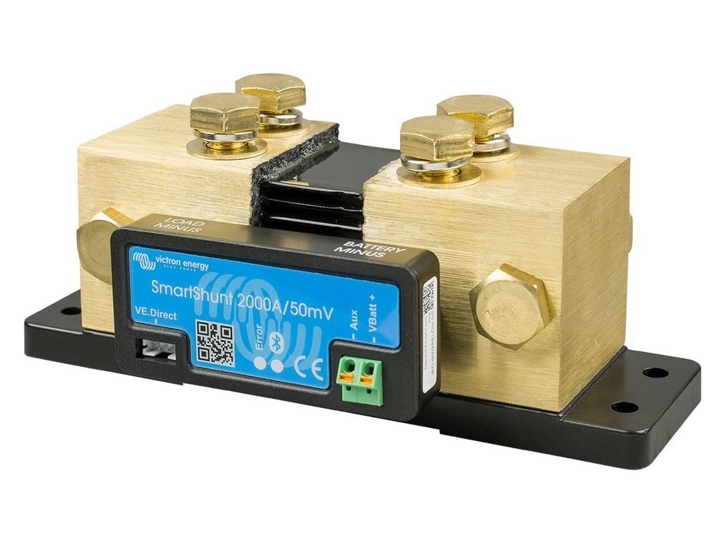 SmartShunt je monitor baterie stejně jako řada BMV (pouze bez displeje). Displejem se stává váš chytrý telefon s aplikací VictronConnect. Zařízení se připojuje přes Bluetooth k aplikaci VictronConnect v chytrém telefonu (nebo tabletu) a pohodlně si můžete přečíst všechny sledované parametry baterie. Alternativně může být SmartShunt připojen a čten zařízením GX. Připojení k SmartShunt se provádí pomocí kabelu VE.Direct. SmartShunt je dobrou alternativou k monitoru baterií BMV, zejména pro systémy, kde je zapotřebí monitorování baterií, ale vyžaduje se méně kabeláže a není požadován klasický displej.