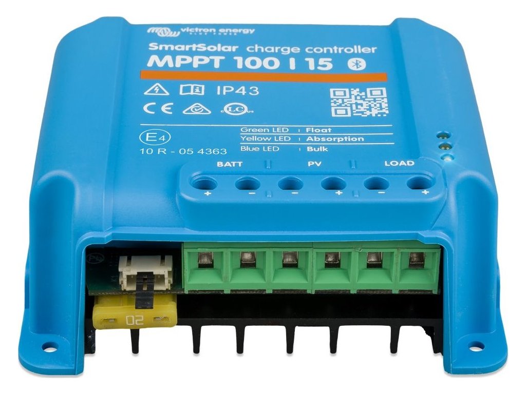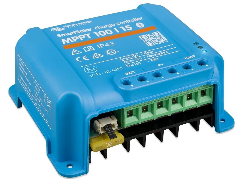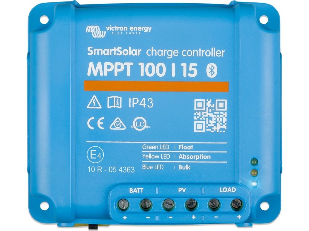 Victron SmartSolar 100/15 MPPTRobustní a rychlý MPPT regulátor pro náročné podmínky s napětím panelů až 100 V, maximální nabíjecí proud 15 A. Baterie 12/24 V, FV max. 220/440 Wp. Vestavěné Bluetooth a VE.direct rozhraní.