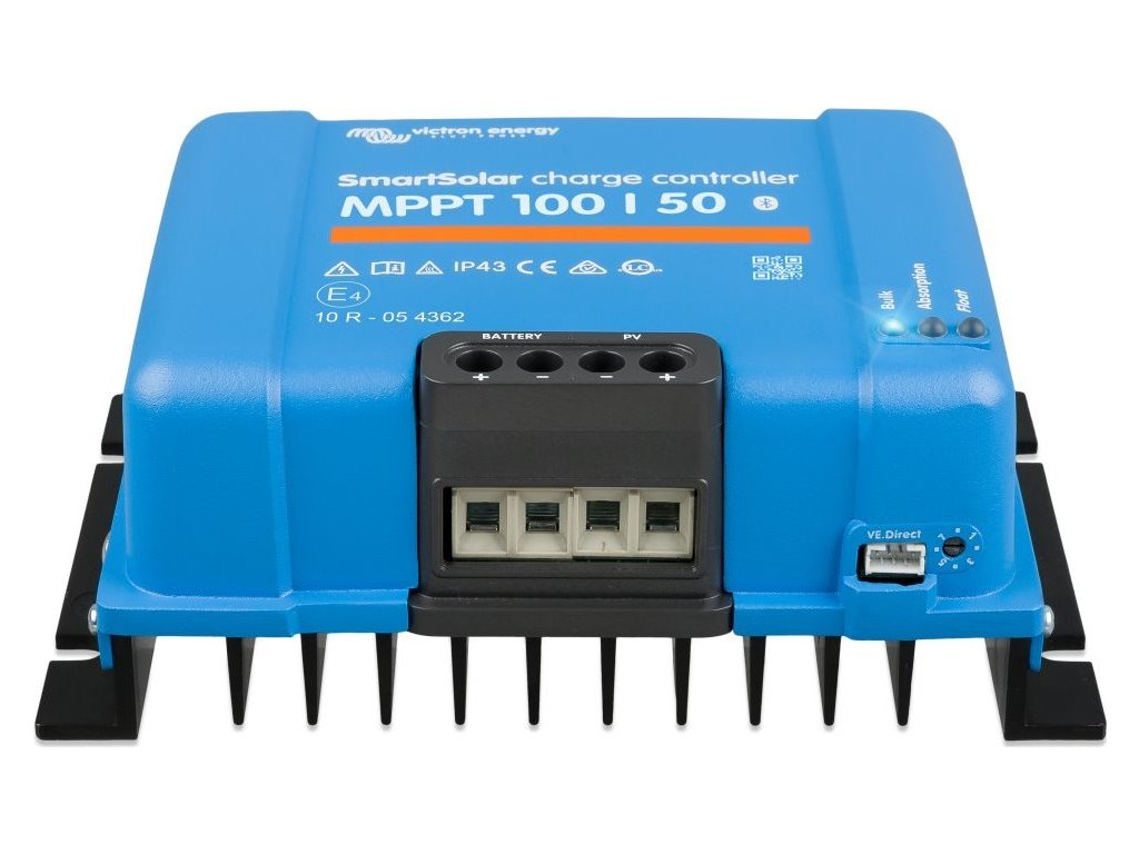 Victron SmartSolar 100/50 MPPTRobustní a rychlý MPPT regulátor pro náročné podmínky s napětím panelů až 100 V, maximální nabíjecí proud 50 A. Baterie 12/24 V, FV max. 700/1400 Wp. Vestavěné Bluetooth a VE.direct rozhraní.