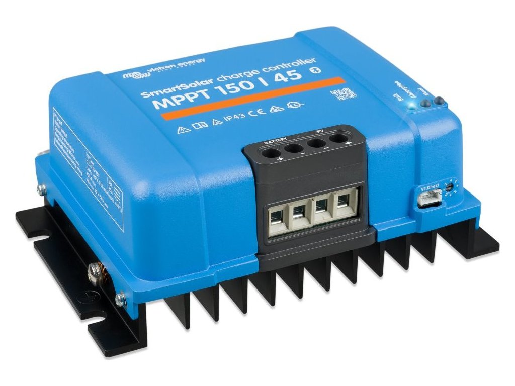 Victron SmartSolar 150/45 MPPTRobustní a rychlý MPPT regulátor pro náročné podmínky s napětím panelů až 150 V, maximální nabíjecí proud 45 A. Baterie 12/24/48 V, FV max. 650/1300/2600 Wp. Vestavěné Bluetooth a VE.direct rozhraní.