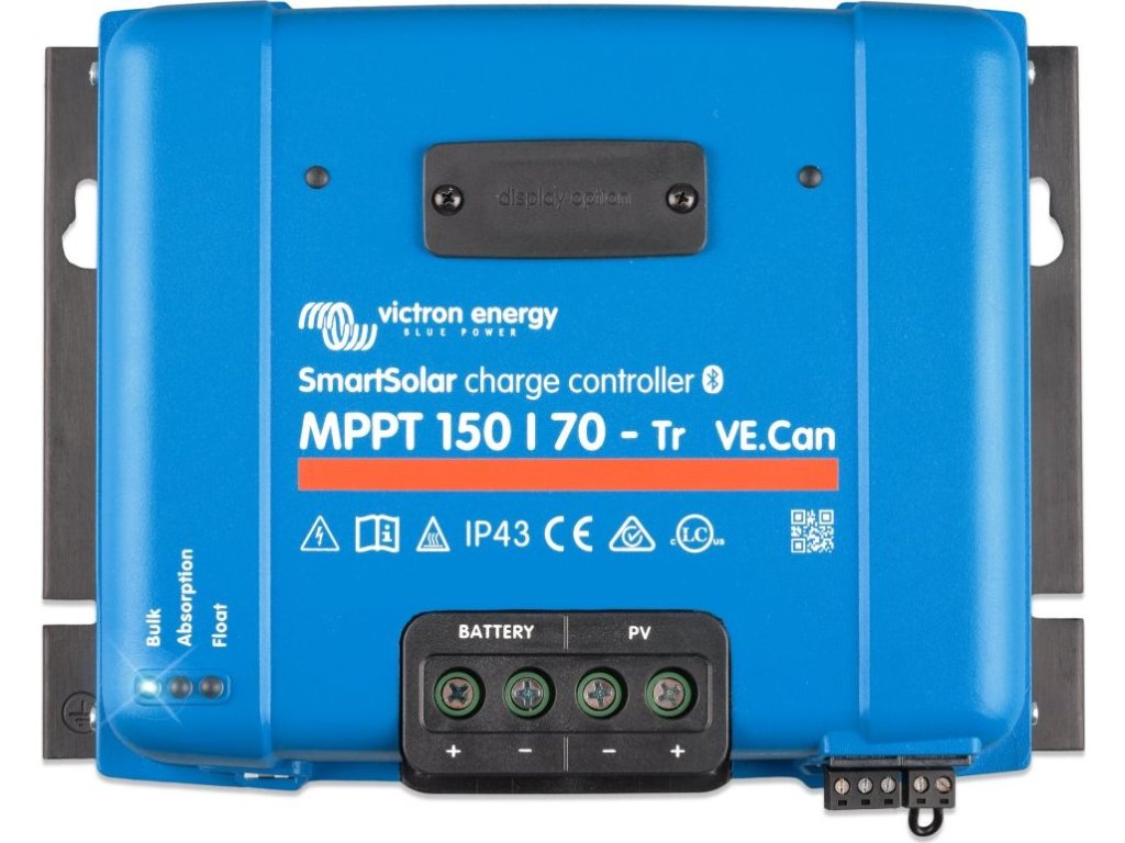 Victron SmartSolar 150/70-Tr VE.Can MPPTRobustní a rychlý MPPT regulátor s VE.Can pro náročné podmínky s napětím panelů až 150 V, nabíjecí proud 70 A. Baterie 12/24/48 V, FV max. 1000/2000/4000 Wp. Vestavěné Bluetooth a konektor pro zásuvný displej.