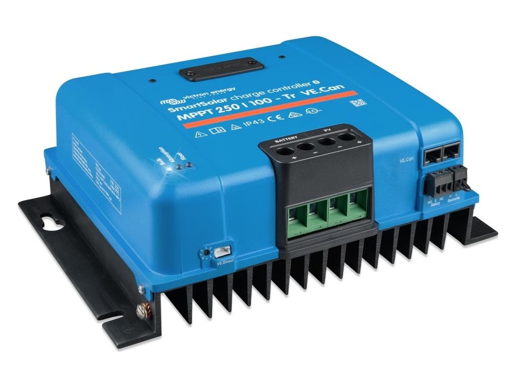 Victron SmartSolar 250/100-Tr VE.Can MPPTRobustní a rychlý MPPT regulátor s VE.Can pro náročné podmínky s napětím panelů až 250 V, nabíjecí proud 100 A. Baterie 12/24/48 V, FV max. 1450/2900/5800 Wp. Vestavěné Bluetooth a konektor pro zásuvný displej.