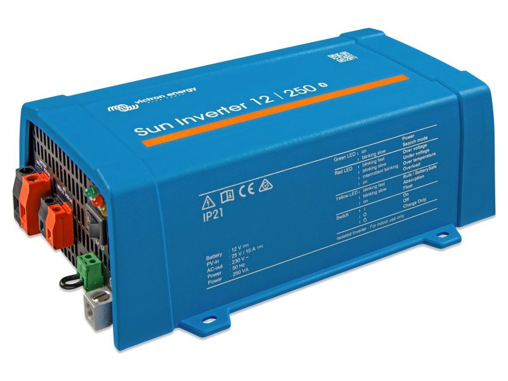 Victron Sun Inverter 12/250-15Solární střídač kombinuje sinusový střídač a solární nabíječku PWM v jednom zařízení, jednoduše se instaluje a vyžaduje minimum kabeláže. Umožní vám napájet domácí techniku vyžadující napětí 230 V AC pomocí obyčejných domácích nebo automobilových 12V baterií. Solární nabíječka zajistí nabíjení baterií energií získanou z vašich solárních panelů. Nabíjecí algoritmus je programovatelný. Parametry invertoru a solární nabíječky lze zobrazit přes Bluetooth pomocí aplikace VictronConnect. Kromě toho lze střídač pomocí portu VE.Direct připojit k zařízení GX nebo GlobalLink 520 pro monitorování systému.