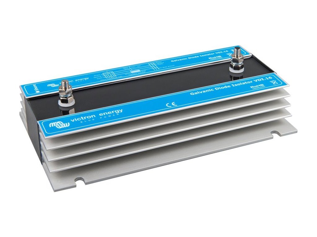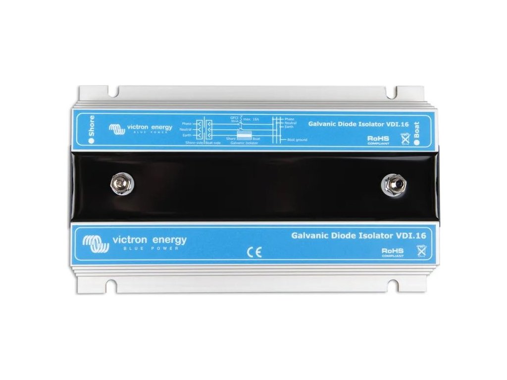 Victron VDI-16S galvanickým oddělovačem ochráníte podvodní kovové části vaší lodi, jako jsou trup, vrtule, hřídel atd., před elektrolytickou korozí. Oddělovač blokuje nízkonapěťové stejnosměrné proudy, které vstupují do lodi přes zemnicí vodič pobřežního napájení. Uvnitř se skládá ze dvou diod, které jsou zapojeny antiparalelně a díky tomu umožňují proud v obou směrech. Napětí, při kterém diody provádí proud, je kolem 1,4 Vdc. Izolátor se instaluje přímo za lodní připojení 230 V.