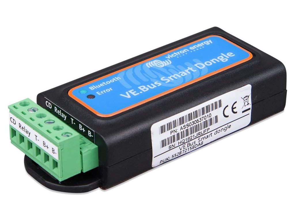 Victron VE.Bus Smart DongleInteligentní Bluetooth VE.Bus rozhraní se snímačem teploty a napětí baterie. Sděluje informace o systému přímo do vašeho chytrého telefonu (VictronConnect app).