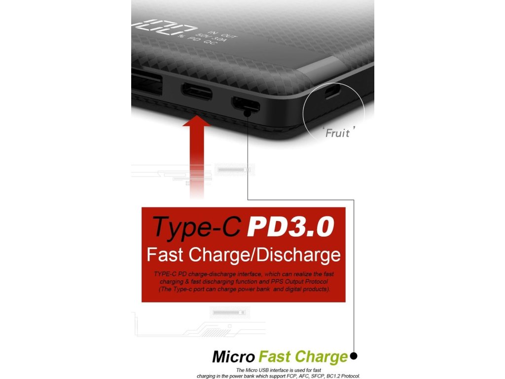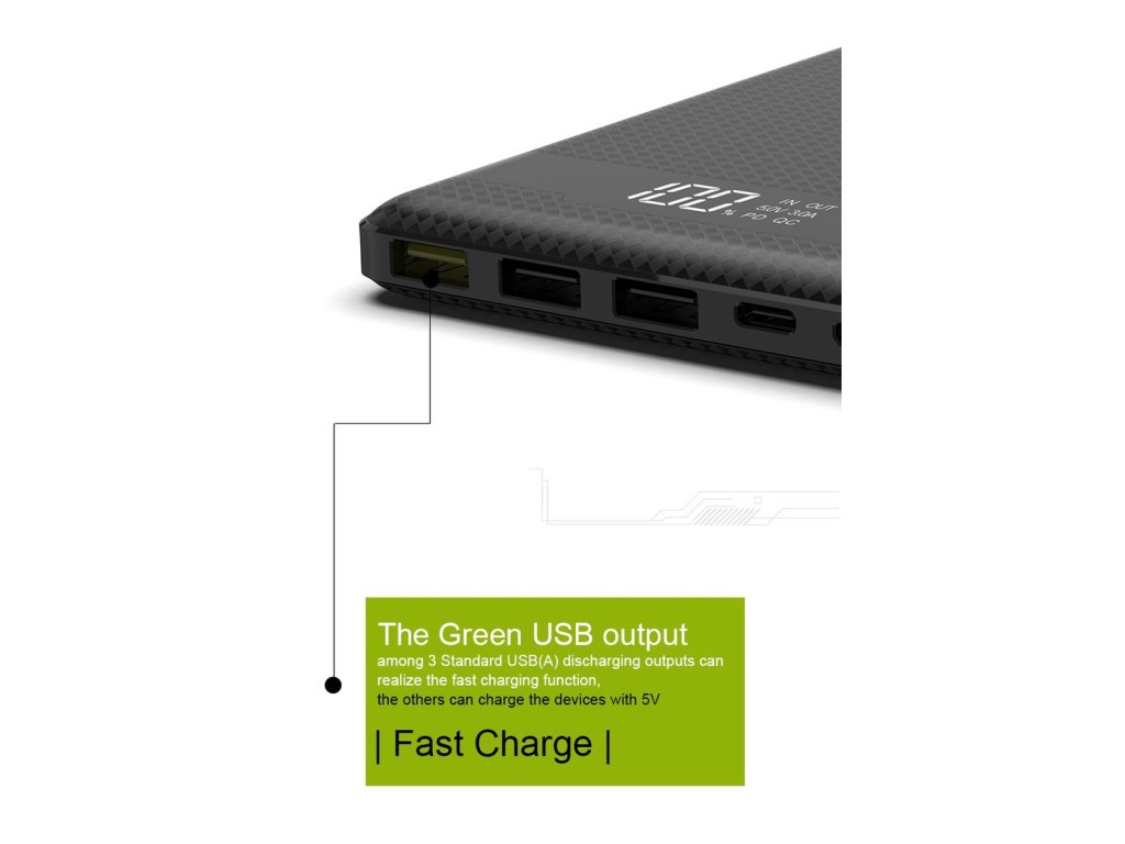 Vestavěný inteligentní elektronický čip (MCU) - automaticky zjišťuje potřebné napětí a proud z nabíjených digitálních produktů a v reálném čase optimalizuje svoje výstupní napětí a proud, aby bylo dosaženo co nejefektivnějšího nabíjení a současně nebyla extrémně zatěžována baterie nabíjeného zařízení.