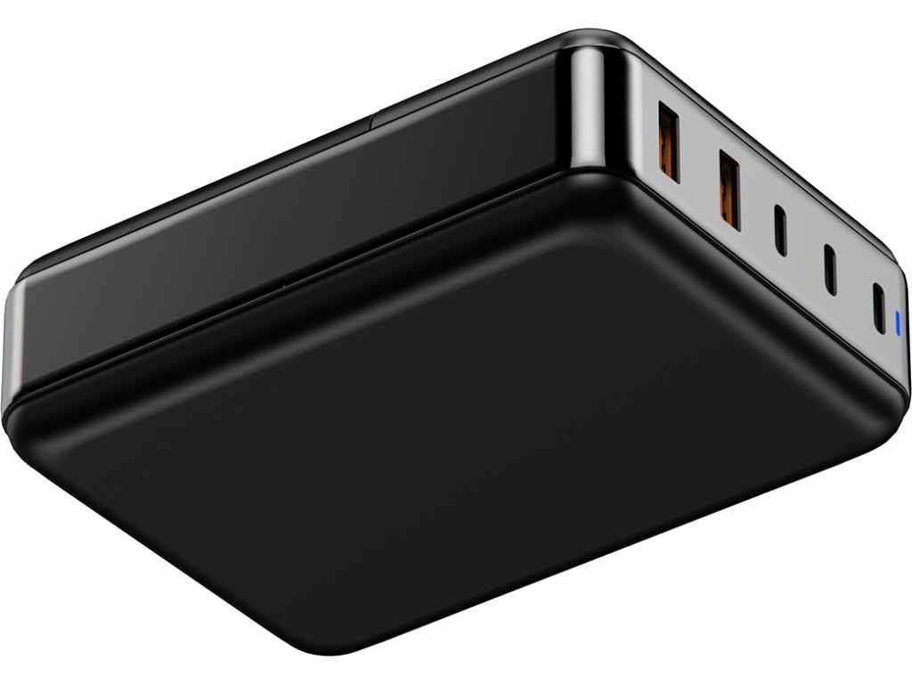Síťový adaptér • 2 x USB-A QC • 3 x USB-C PD • podpora rychlonabíjení Qualcomm Quick Charge 3.0 a Power Delivery 3.0 • chytré sdílení výkonu • maximální výkon 200W • technologie GaN • možnost nabíjení až 5 zařízení současně • praktický stojan v balení