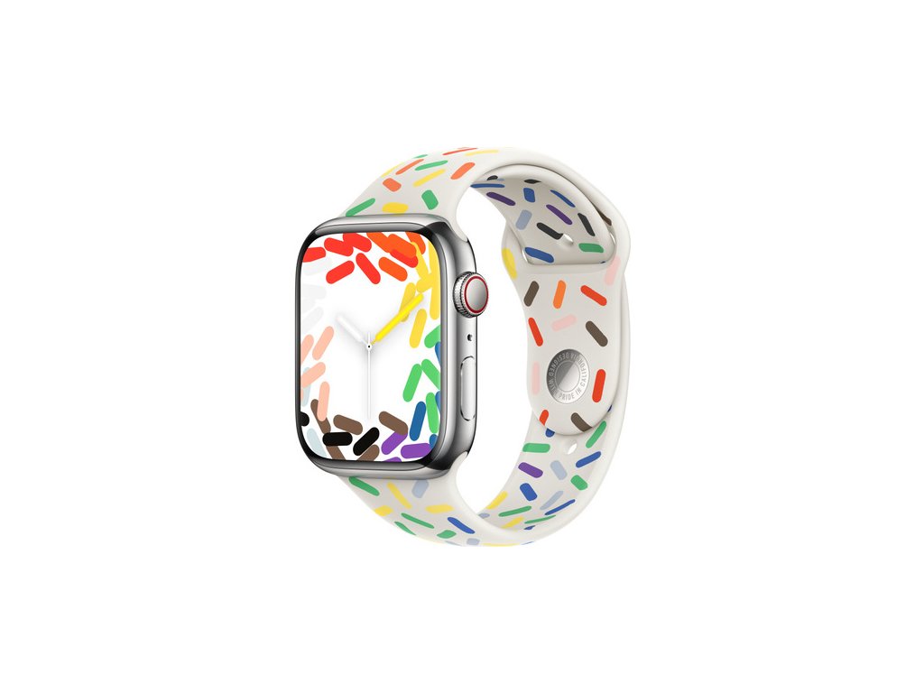 Sportovní řemínek Pride Edition zdobí celá paleta zářivých barev na oslavu krásy a rozmanitosti komunity LGBTQ+. Kromě základních barev vlajky Pride jsou na něm ještě černá a hnědá, které symbolizují marginalizované nebělošské LGBTQ+ komunity a lidi zasažené HIV/AIDS. Světle modrá, růžová a bílá patří trans a nebinárním lidem.