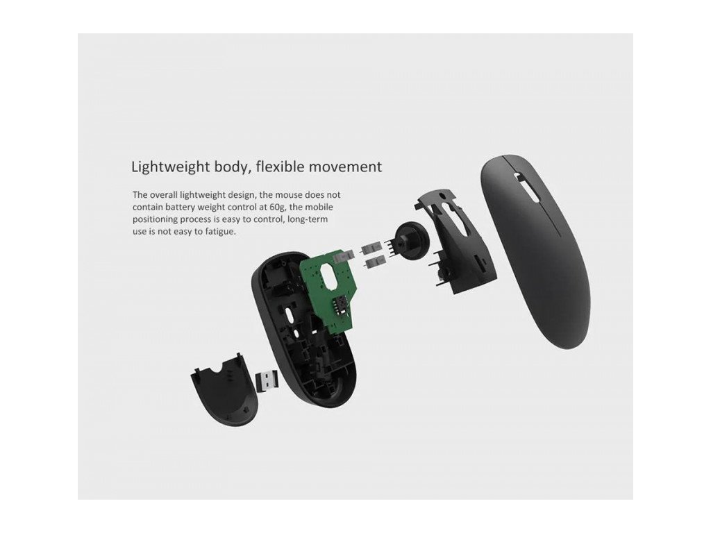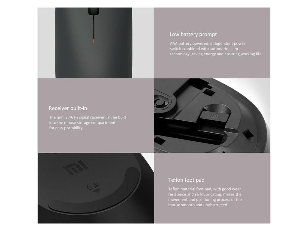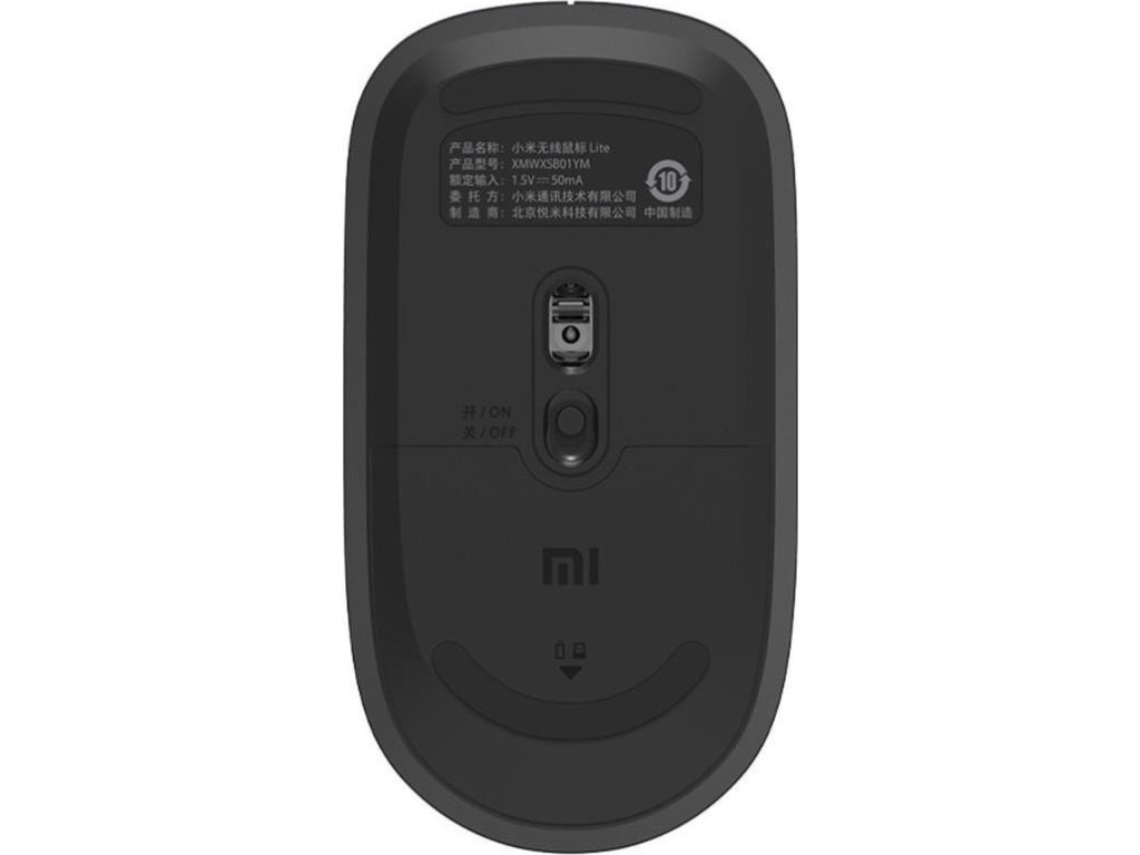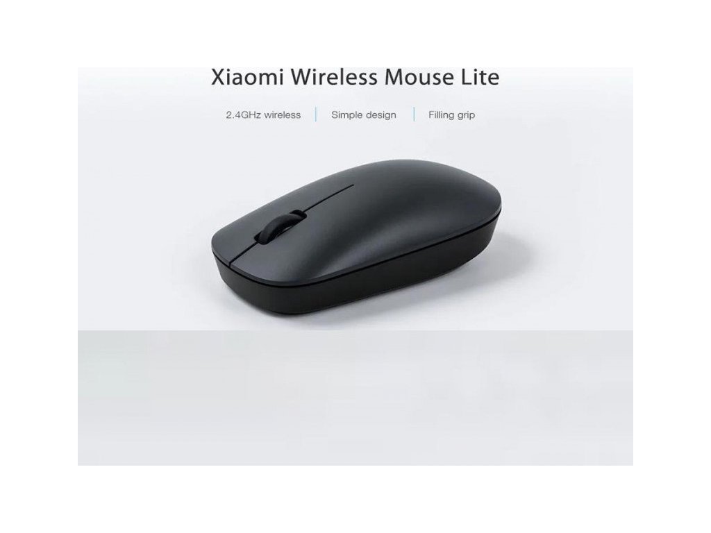 Xiaomi Wireless Mouse Lite Black - velmi jednoduchá bezdrátová myš, hmotnost pouhých 60g (bez baterií), přenos přes 2,4GHz pásmo a USB nano receiver (součástí balení, vejde se do myši), provoz na jednu AAA baterii (není součástí balení).