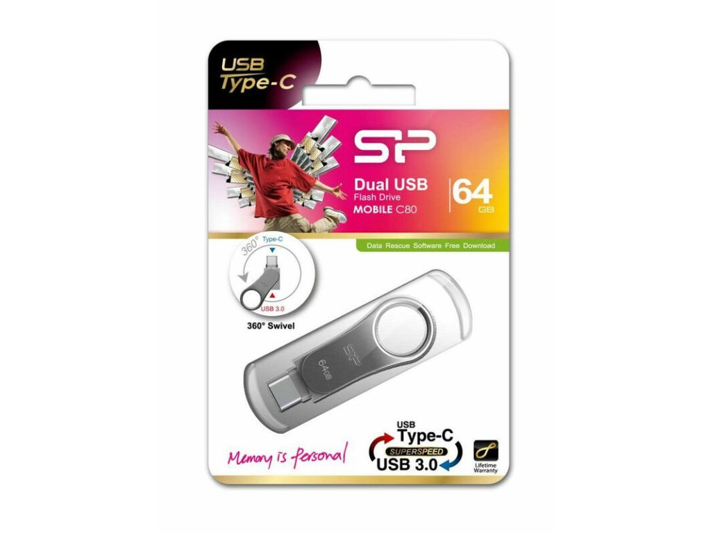 Flash USB Silicon Power Mobile C80, 64 GB, USB-C / USB 3.2 Gen 1, strieborná